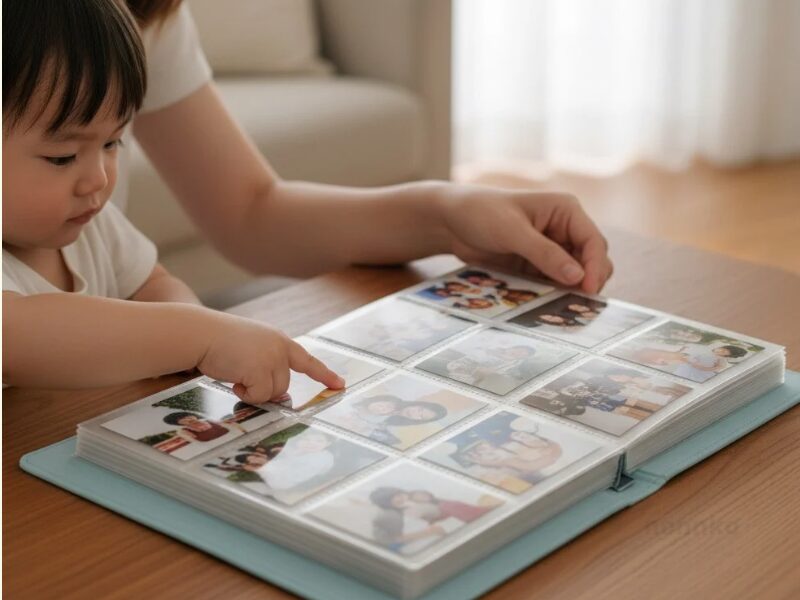そのまま入れるだけでも十分ですが、ときどきシールやひと言メモを添えています。「初めて〇〇できたよー」「お気に入りのおもちゃ」など、小さなコメントがあると記憶が鮮やかによみがえります。