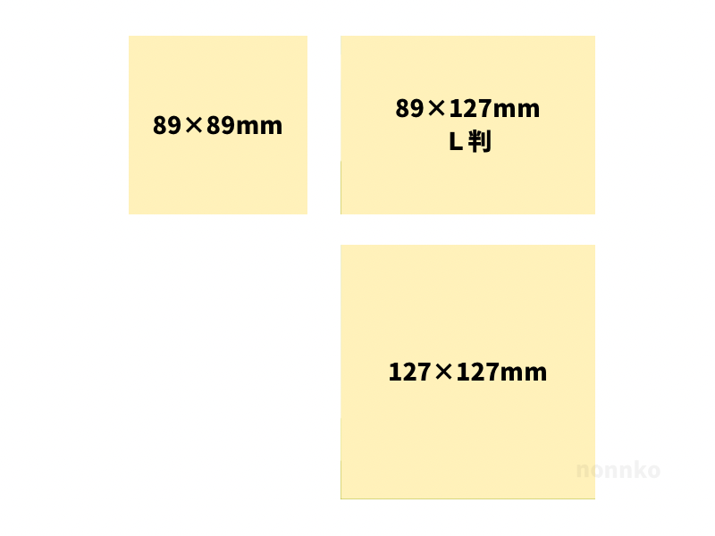 ましかくプリントは、日本の標準的な写真サイズであるL版写真の短辺89mmと長辺127mmをそれぞれ正方形にした2種類があります。