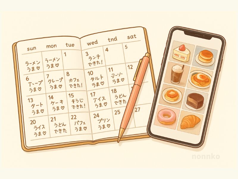そんな日は「(場所)のソフトうま♡」「ご褒美のフラペチーノ♡」など、嬉しかったことの食べ物日記に頼りがち。でも数年後…